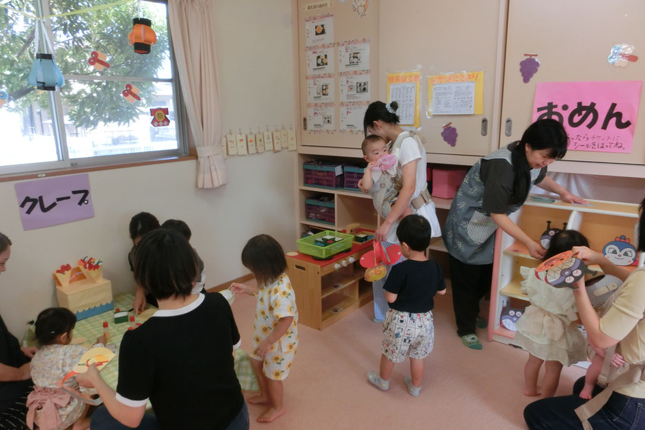 こんにちは支援センターなかばたです。 食欲の秋、読書の秋、スポーツの秋、実りの秋…楽しみの多い季節がやってきました。 先日秋祭りを行いました。お友だちと美味しそうなチョコバナナやクレープを作ってとても楽しそうでした。