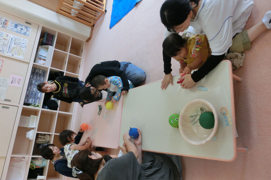 こんにちは支援センターなかばたです。日中は夏と変わらないような暑い日もありますが、日が落ちるのが随分と早くなってきましたね。先日のわくわく1歳児では、水風船に顔を付けたものと一緒に水遊びをしました。とても可愛い顔の水風船ができました。